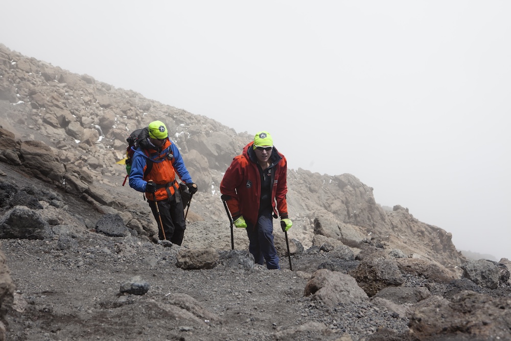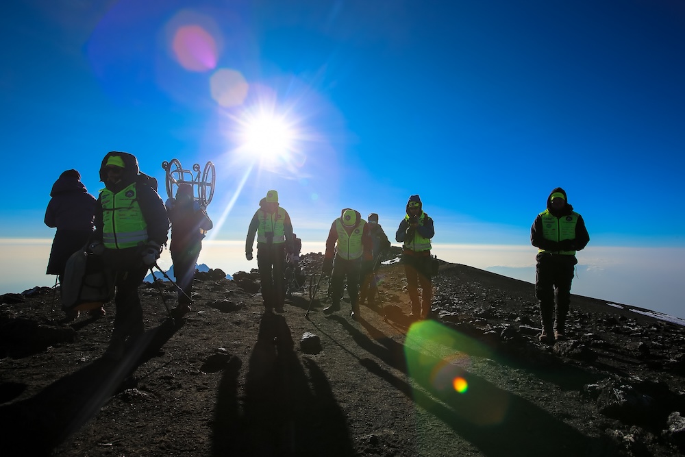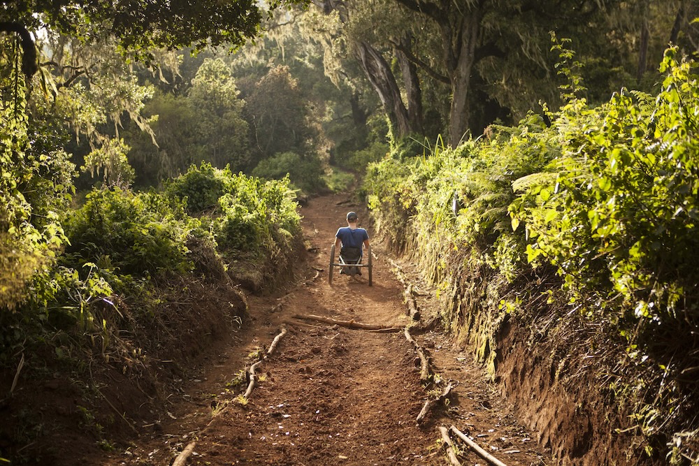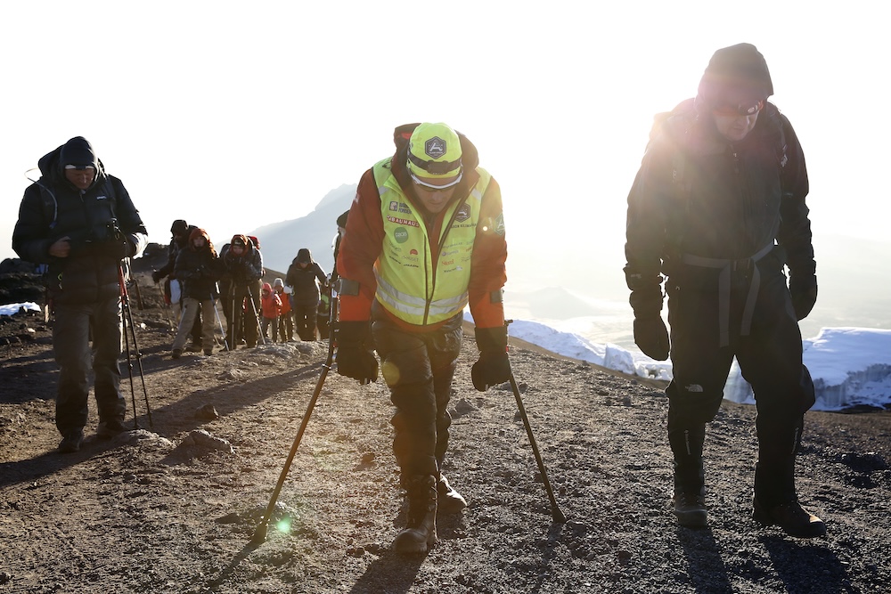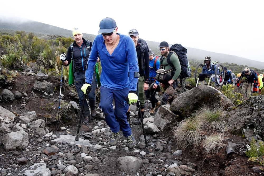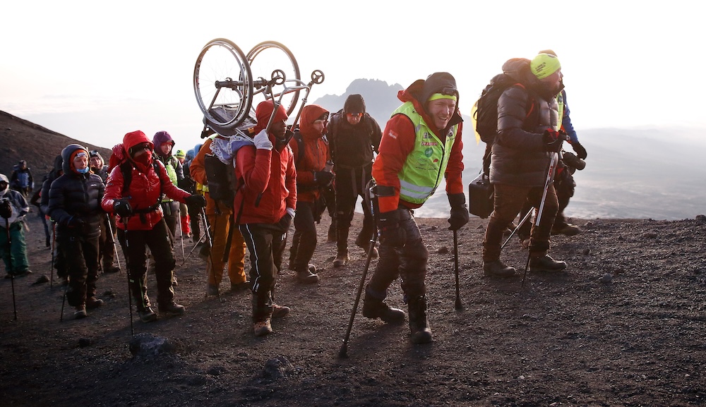 I början av januari reste vi till Tanzania. Bestigningen tog oss genom flera olika klimatzoner: från tät djungel till ökenliknande landskap, vidare till karg stenöken och slutligen glaciären på toppen. Jag tog mig fram på kryckor och i min terränggående armcykel.