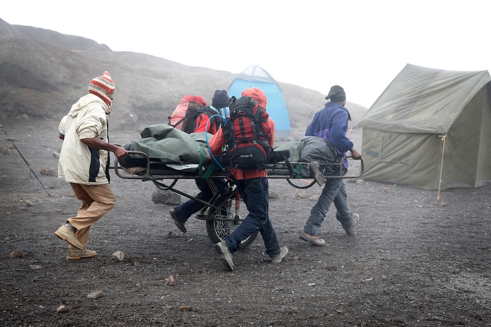 Guiderna konstaterade snabbt att han fått både hjärn- och lungödem. De lade honom på en “bergsambulans” – en bår med ett hjul – och sprang nedför berget i full fart. Det var livsfara.